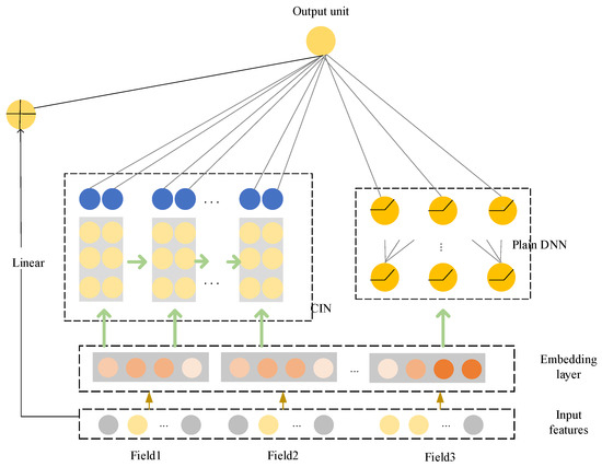 With the great success of Deep Neural Network (DNN) in various fields, researchers have proposed several DNN-based factorization models in order to learn low-order features and higher-order feature interactions [17]. Although DNN have the power to learn arbitrary functions from data, the method generates element interactions implicitly at the bit level. Therefore, scholars have proposed a novel Compressed Interaction Network (CIN) based on DNN which aims to generate feature interactions in an explicit manner over a vector approach, and further combine CIN and DNN into a unified model and name this new model as xDeepFM [18]. In the previous feature interaction algorithm, three modules have been developed for the content of the embedding layer, implicit higher-order interaction and explicit higher-order interaction. On the basis of these three modules, the compressed interaction network is proposed.