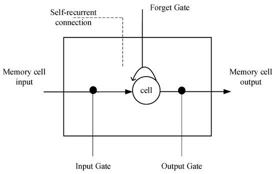 The LSTM is a kind of temporal recurrent neural network, which is specially designed to solve the long-term dependence problem of general RNN in dealing with long sequences. It solves the problems of insufficient long-term memory, gradient disappearance and gradient explosion of RNN, and enables recurrent neural networks to really use the long-distance temporal information effectively [21]. Unlike RNN, LSTM adds three types of logic control units to RNN, namely input gate, output gate and forget gate. The LSTM connects each of these three cells to a multiplicative element, and controls the input and output of the information flow and the state of the memory cell by setting the weights at the edges where the memory cell of the neural network is connected to the other parts. The specific structure of the LSTM neuron is shown in Figure 2.