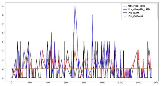 Through error calculation and comparison, the total number of commodities in the test set is 1263, and the number of commodities whose error value after residual correction is smaller than the error value before correction is 964, and the correction optimization rate has reached 76%. To further verify the superiority of the xDeepFM-LSTM model, this study compares it with both NN, SVR, ARIMA, Naive, CatBoost, LSTM, and xDeepFM prediction models. With regard to the parameters of models, we utilize the Akaike’s Information Criterion (AIC) to determine the order of the ARIMA model. In addition, the grid search method is employed to tune the parameters for the NN, SVR, Catboost, LSTM, xDeepFM, and xDeepFM_LSTM model. In addition, to be able to evaluate the performance of the models proposed in this study more objectively, we also calculated the error values of different models based on the simulation data. The error evaluation results of each model are shown in Table 2. Subsequently, we selected three top-performing algorithms, the xDeepFM-LSTM algorithm, the LSTM algorithm and the CatBoost algorithm, and compared their predictions with actual sales, and the results are shown in Figure 4.