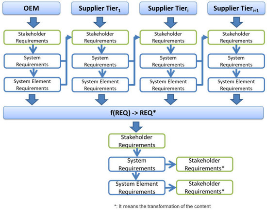 The first step of product development is the requirements analysis. This step is mandatory in all applied system development lifecycles like waterfall or V-Model. As part of the requirement analysis, standards such as ISO/IEC 12207:2017 [13] and ISO/IEC 15288:2008 [14] describe the declarative and procedural knowledge of the requirement analysis. With this, the process starts defining the mechatronic product’s stakeholder requirements, which are the primary information source for design and testing. Subsequently, the stakeholder requirements are transformed into system and system elements requirements to define mechatronic systems’ boundaries. Then, a supplier can perform the development process of a mechatronic system. For that purpose, the OEM’s system and system element requirements are the primary input source for the supplier-specific development process. The transformation of stakeholder requirements into system and system elements requirements is not executed just once by the OEM but rather recursively within the supply chain. The recursive translation mechanism, which is strongly simplified, is presented in Figure 2.