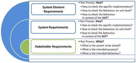 The above-described recursive transformation of requirements directly impacts the test processes. Each test process for a mechatronic system checks the received stakeholder requirements and the derived system and system element requirements. Both types of requirements are necessary to enable a test process considering the provided function. In doing so, the system and system element requirements define the unit tests’ scope, and the stakeholder requirements define the scope of integration tests. Figure 3 demonstrates the interplay of requirements types in more detail.