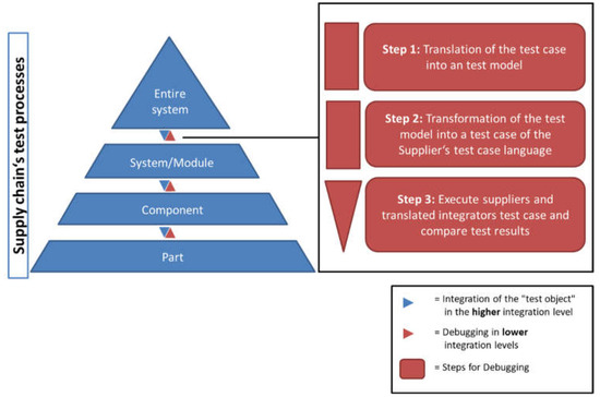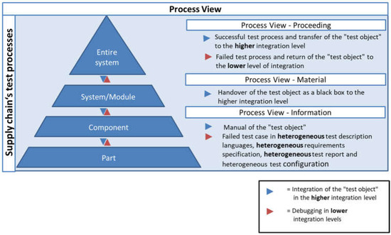 The test processes as part of the development process are shown in Figure 4. It is based on a supply chain and is structured as a supply pyramid. The primary goal of the lower layers of the pyramid is to deliver their products, which will be integrated and tested on the higher layers. In a faulty-free development process, a part is integrated into a component, a component is integrated into a system, and the system is integrated into an entire test bench to check the mechatronic product. In each of the test processes, the test cases of the supplier passed as well as the corresponding test cases from the integrator.