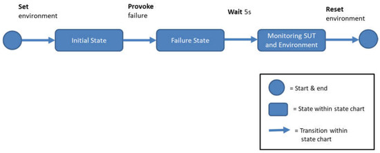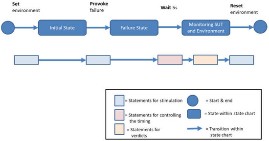 As shown in Figure 5, a test case stimulates three consecutive states in the SUT. First, the test case stimulates the environment [24]. The error is then stimulated, and the SUT is finally observed. This proceeding of states is achieved by executing a sequence of statements. The state-changing statements are attached to the arrows in the figure. In order to check whether the SUT has reached a target state or whether it has waited long enough, statements are listed within the state.