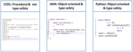 Apart from the two groups of test script languages, the typing, the programming paradigm, and the execution modus have an essential impact on the syntax of a test script language. Examples of the impact of the programming paradigm and type safety are shown for CCDL, JAVA and Python in Figure 7.