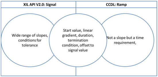 The heterogeneity of the function ramp for the test script languages CCDL and XIL API (https://www.asam.net/standards/detail/xil/older/ accessed on 15 August 2022) is shown in Figure 8 below. These two test script languages were selected as examples because CCDL is primarily used in aviation, and XIL API is primarily used in automotive.
