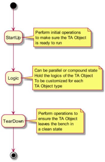 The presented solution focuses on the interoperability of test cases. For that purpose, Generic SCXML is applied as an interoperability model to represent test cases over the boundaries of a specific test script language. Hereby, SCXML is a state chart defined by the W3C. The technology state chart is a common approach to model test cases as test models in the domain of model-based testing [36,44]. Thus, the selection of SCXML is completely aligned with the provided tool landscape of the test bench supplier. Moreover, the execution of test cases in SCXML is also possible. For that purpose, the SCXML standard (https://www.w3.org/TR/scxml/#eventioprocessors accessed on 15 August 2022) defines the baseline for an execution engine. Integrating SCXML test cases into the MBSE & MBT models is also possible because they share the underlying technology state charts. With this, SCXML as an interoperability model can be completely integrated into a test process’s design, specification, implementation and execution phase.
