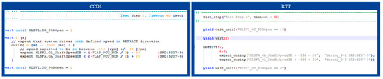 As can be seen in the extract of Figure 15 by [23], the RTT test case (on the right) looks very similar to the selected CCDL test case (left), and both representations are human-readable. However, some information is affected by the translation process. For instance, constants contained in the original scripts are resolved to their numerical representation during the conversion process. They can therefore be displayed only as a number in the resulting representation.
