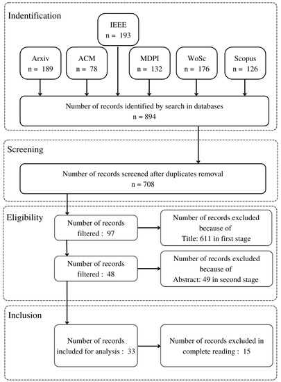 Figure 1 depicts the revised flowchart for PRISMA in [6]. This systematic review’s data gathering approach followed a logical progression until only 33 publications were deemed appropriate for analysis. Each database indicated in Section 2.1.1 as a source of publications was recognized, along with a total of 894 papers for the selection process. Following the identification stage, a screening was conducted to eliminate duplicate documents. Certainly, a journal or conference-published work may be archived in at least one research database. In this stage, 708 papers were retained after screening. The last step was to apply the eligibility criteria to select the best articles according to the Section 2.1.3 and Section 2.1.4 Table 2. In the first screening, 97 articles were kept and 611 were rejected based on their titles; in the subsequent screening, 48 papers were retained and 49 were rejected based on their abstracts. After a thorough reading of each manuscript, 33 were ultimately chosen for study, while 15 were discarded.