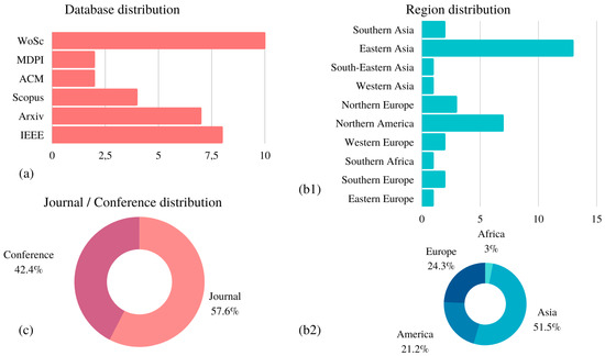 Frequency of research database, conference or journal and by geographical distribution of publication. (a) is the distribution of the different databases from which we collected papers in this study. (b1,b2) represent respectively the distribution of the selected papers by region and by continent. (c) the distribution of papers by conference and journal.
