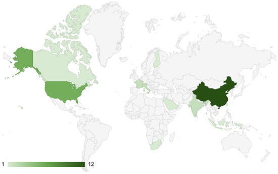 The map in Figure 3 describes the degree of contribution of countries in Artificial Intelligence (NLP) in biomedical text classification from 1 January 2016 to 10 July 2022. China largely dominates in this study, followed by the USA, this result coincides with the result published in Artificial Intelligence Index Report 2022 [37].