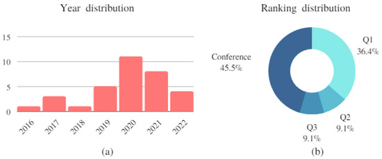 Table 8 shows the frequency and number of papers per year and per ranking. As mentioned above, the time range considered for the selection of articles for analysis in this systematic review was from 1 January 2016 to 10 July 2022. The year 2020 counted 11 papers and represents 33.3% of the papers compared to other years with low representatives in the classification of biomedical texts. In addition, the ranking was considered as one of the major eligibility criteria of papers for analysis in the case of papers published in journals. All the papers whose category is none are published in an international conference. Considering the ranking, more of the selected papers, i.e., 12 out of 19 papers published in journals, were of Q1. Figure 4 presents the different frequencies in the analysis for the year and the ranking distribution.