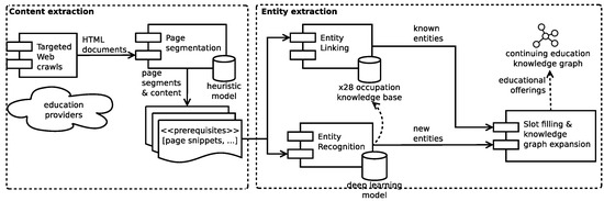 The system’s knowledge graph population pipeline expands the continuing education knowledge graph by analyzing the Web pages of educational offerings i. A page segmentation and classification component extracts relevant page segments with {target group, prerequisite, learning objective, course content, certificates & degree} from these pages. Afterward, entity linking identifies known entities such as skills and occupation within the segments and links them to the ×28 occupation knowledge base. We complement entity linking with entity recognition, which is capable of identifying entities that are not yet available in the knowledge base. The extracted new entities serve as candidate entities for extending the ×28 occupation knowledge base, and considerably improve the coverage of the entity extraction process.