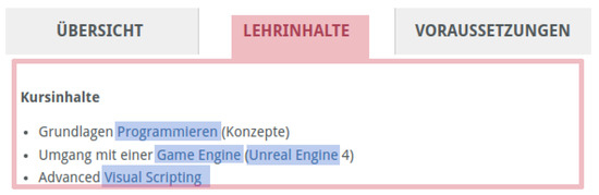 Finally, the slot filling component fills for each educational offering i the slots outlined in Table 1 by contextualizing the extracted entities with the information on the page segment type from which they have been extracted. In the real-world example shown in Figure 3, the slot value with surface form “Programmierung” (cc:25002374 (identifier for the knowledge base concept “programming”)) extracted from the page segment “Lehrinhalte”, for example, fills the course content slot (cc:hasCourseContent), while the same entity extracted from the segment “Voraussetzungen” (so:programPrerequisites) would be considered a prerequisite for visiting the course.