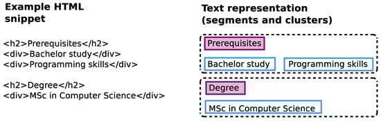 Afterwards, the algorithm tries to identify cluster titles based on the HTML title elements {h1, h2, h3, h4, h5, h6}. In practice, not all titles use a title element as specified in the HTML standard, in which case the following fallback heuristic may be applied for identifying non-standard title segments: (i) The segment’s text must not contain more than three words; (ii) At least one word of the candidate text must appear in a domain-specific list of commonly used title terms such as ‘prerequisite’, ‘content’, and ‘degree’.
