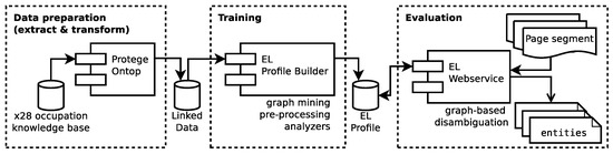Similar to other machine learning components, we differentiate between data preparation, training, and evaluation (Figure 5). The data preparation step facilitates the Protege Ontop (https://github.com/ontop/ontop, accessed on 17 October 2022) framework to transform the ×28 occupation knowledge base into a Linked Data representation. The resulting mapping has a significant impact on the further process since it defines the relations and data points the system can utilize for training the entity linking component.