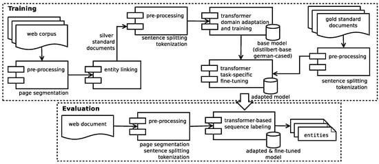 A domain adaptation and initial training step use a domain corpus of 28,000 documents that has been enriched with silver standard annotations obtained from the previously described EL component. To improve the model’s capabilities of capturing new entities, we performed a fine-tuning step that draws upon the gold standard documents to generate the final model. A five-fold cross-evaluation procedure ensures that no training documents are used within the evaluation. Table 2 summarizes the parameters used for training and evaluation (all experiments have been performed on version 4.12.5 of the transformers library), and Figure 6 outlines the model structure and the training process.