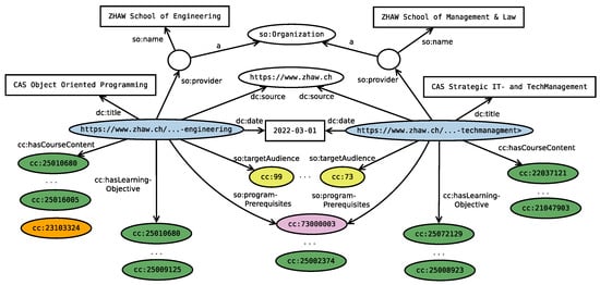 Figure 7 shows a small fraction of the created graph which comprises two courses offered by the Zurich University of Applied Sciences. The visualization replaces rdf:type statements with color coding, and only shows a fraction of the assigned skills, industries, occupations, and degrees.