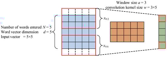 Each convolution kernel performs one convolution operation to obtain a new feature representation, Assuming N = 5 and d = 5, the input is a 5 × 5-word vector with a window matrix , and let a = 3, the size of the convolution kernel W is 3 × 5. After convolving x0:2,x1:3,x2:4,x3:5,x4:6 with w in turn by Equation (13), the new feature representation corresponding to the input word sequence can be obtained. The text sequence convolution process is shown in Figure 7.