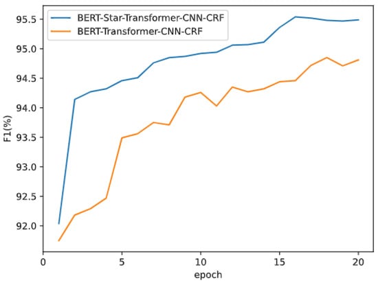 The comparison results of F1 values between the BERT-Star-Transformer-CNN-CRF model and the BERT-Transformer-CNN-CRF model at each iteration cycle are shown in Figure 11. The comparison shows that the BERT-Star-Transformer-CNN-CRF model converges faster and is able to reach a higher F1 value in the early training period, and continues to improve and finally maintains at a higher level. While the BERT-Transformer-CNN-CRF model has a faster convergence speed after the first five iterations, it only obtains a higher value after many iterations, but never exceeds the BERT-Star-Transformer-CNN-CRF model.