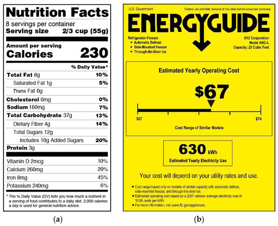 (a) Nutrition Facts label format (modified from [31]), left, and (b) energy guide label format [32], right.