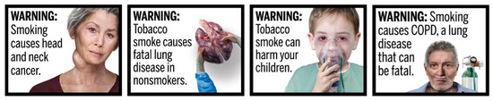 The FDA proposed new labels, in 2019 [39] (examples of which are shown in Figure 3), which were planned to launch in June of 2021. These labels build upon the graphical approach shown in Figure 1. Their required use has been delayed several times [41]. Similar efforts have been undertaken by other countries. New Zealand’s Smoke-free Environments Regulations of 1999, for example, require tobacco products to include a graphic health warning [42]. While the law was challenged by the tobacco industry, it was ultimately adopted and had significant support from the public [42].