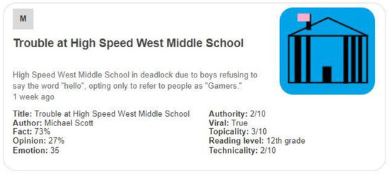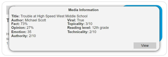 Informational labels 1 and 3 also include the article’s original headline, image, and introductory text. This preserves more of the original article’s elements which are intended to be attractive to the user and draw them into clicking the link and viewing the article. This is similar to how nutrition facts are added to the side of a container while still including the product’s branding information and imagery. Informational label 3 provides additional supporting information for each label category, helping the user to interpret it.