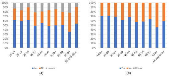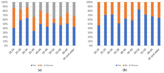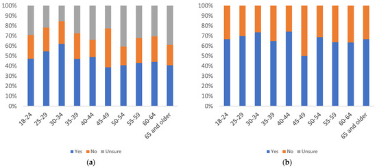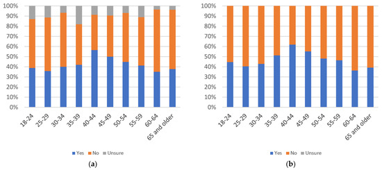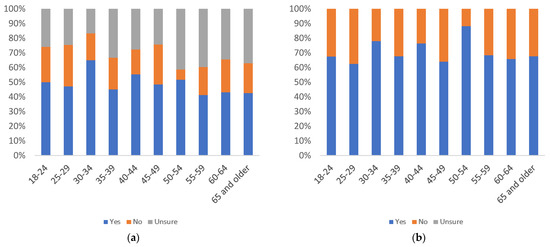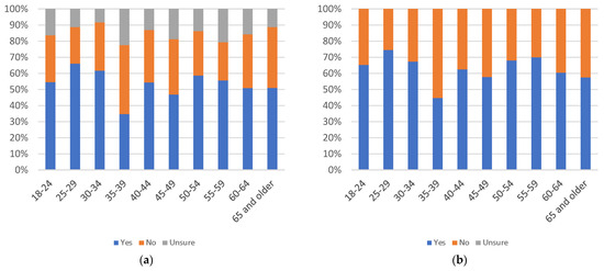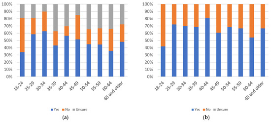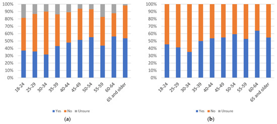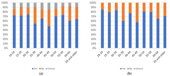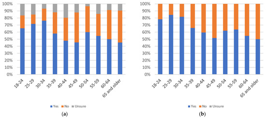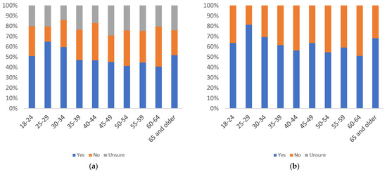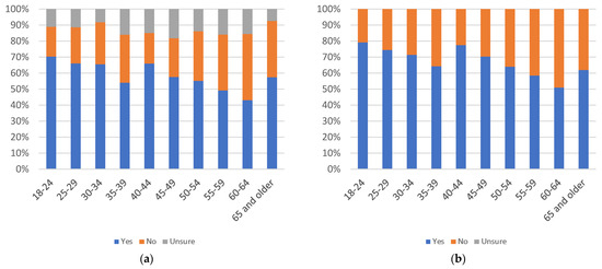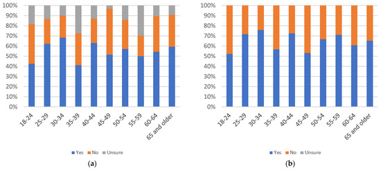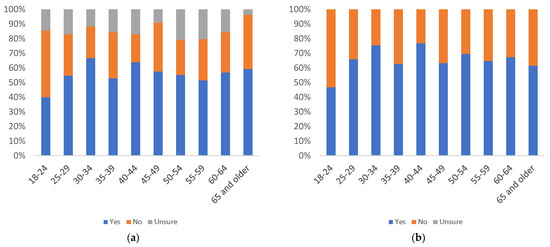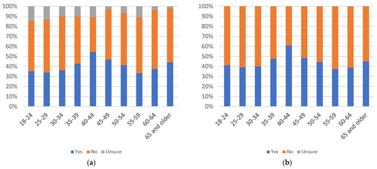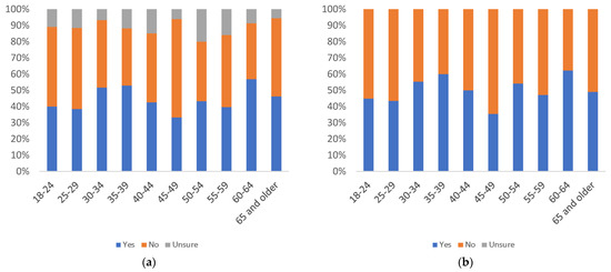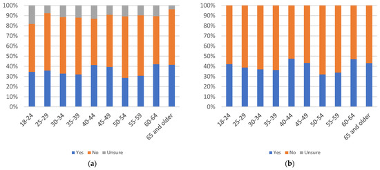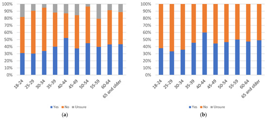 Label others’ use, by age group: (a) with uncertain respondents (left) and (b) without uncertain respondents (right).