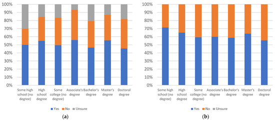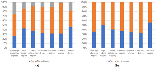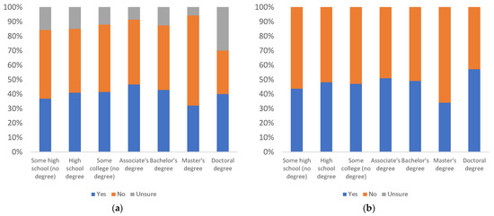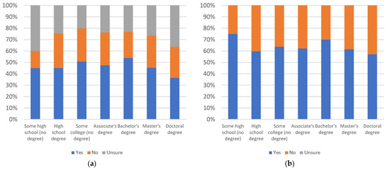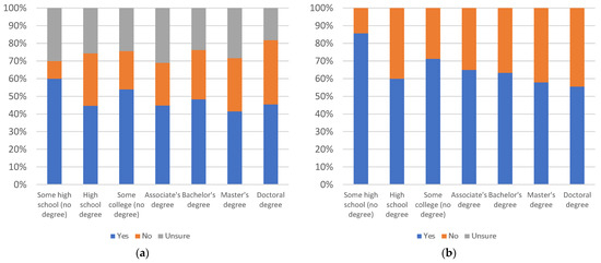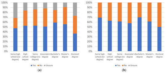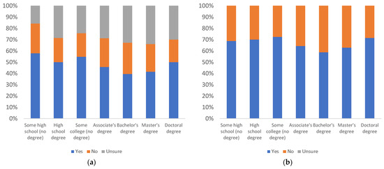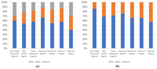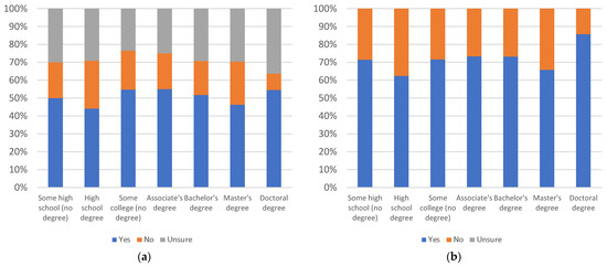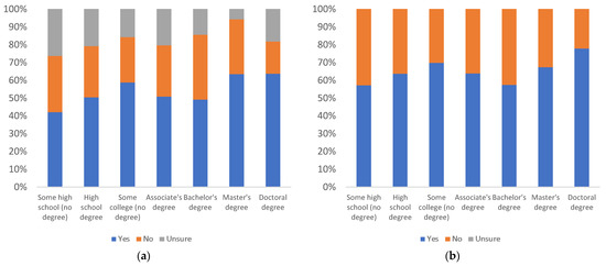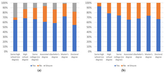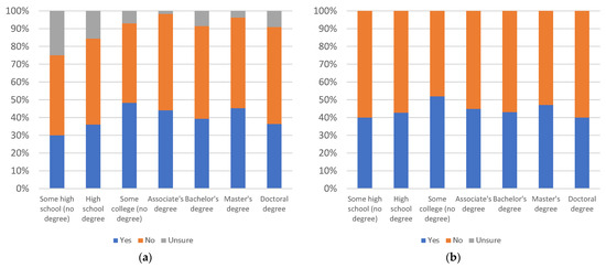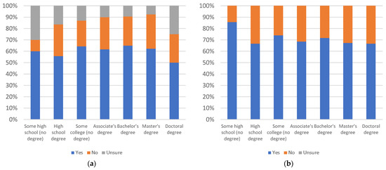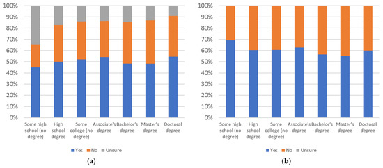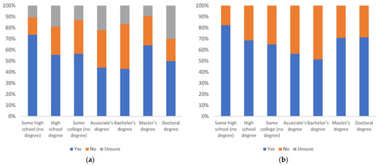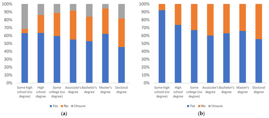 By education level, there is an overall increase in yes responses, as education level increases. The lowest percentage of yes responses is at the some high school education level, and while the percentage of yes responses declines from the some college to bachelor’s degree levels, it increases again up to its peak at the doctoral degree level. Only three of the seven education groups (some college, master’s degree, and doctoral degree) have at least 50% yes responses, when uncertainty is factored in. All groups have at least a 50% level of yes responses, when uncertainty is not considered.