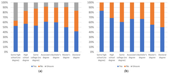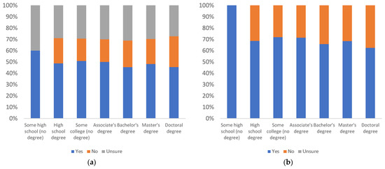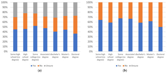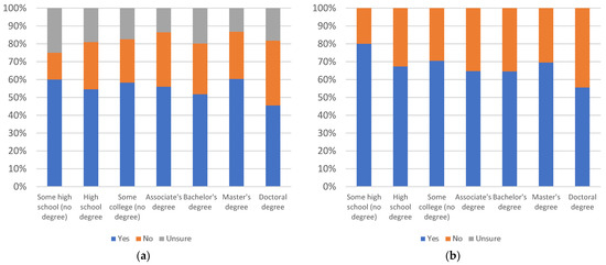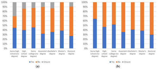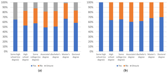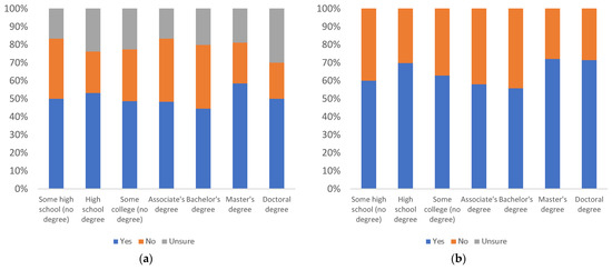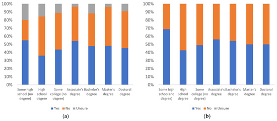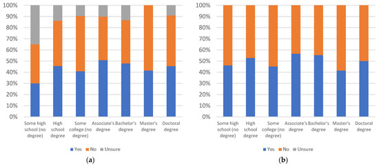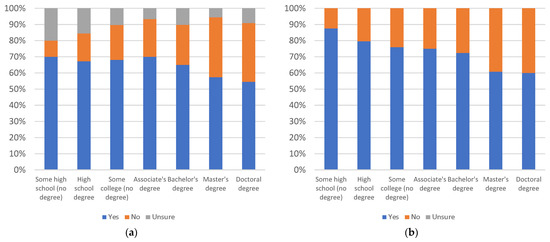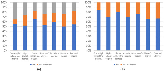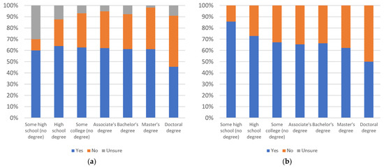 Label helpfulness, by education level: (a) with uncertain respondents (left) and (b) without uncertain respondents (right).