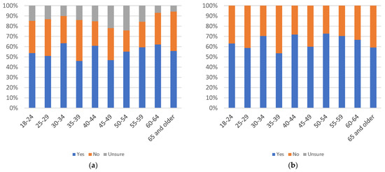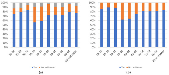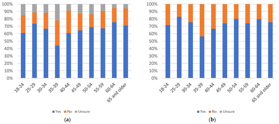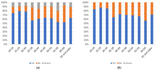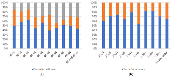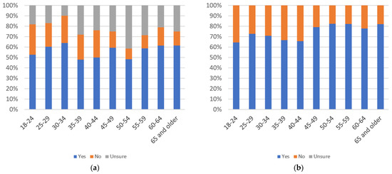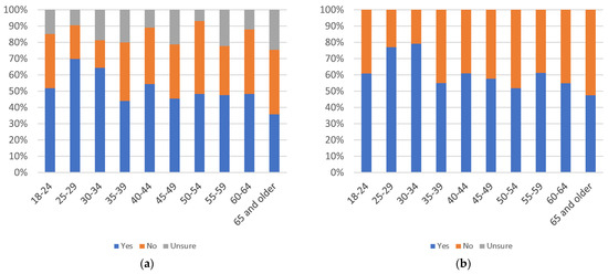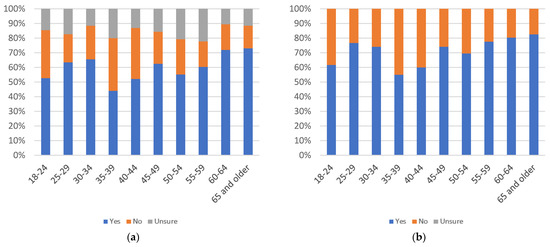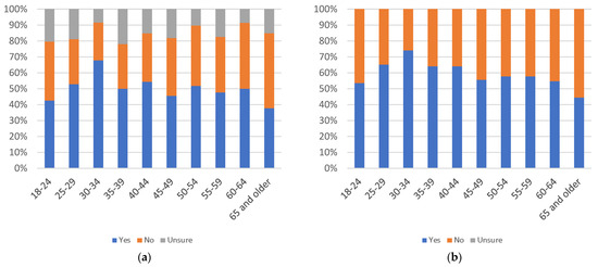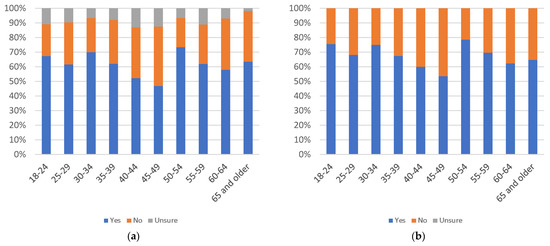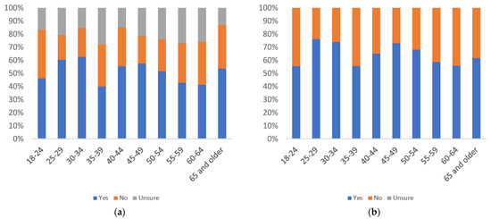 In terms of age, there is a decline in perceived helpfulness as age increases. There are slight spikes in yes responses at the 40–44, 55–59, and 65 and older age groups. The number of uncertain responses shows no discernible pattern. Age groups other than 35–39, 45–49, and 60–64 show at least 50% answering yes even when uncertainty is factored in. When uncertainty is not considered, only the 60–64 age group maintains less than 50% yes responses.