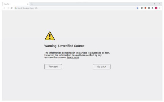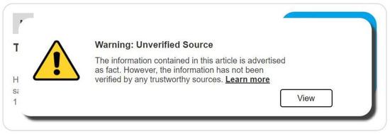 Deceptive content must first be identified before it can be labeled with a warning. Numerous techniques are possible (see [58,59]). Approaches can be manual, automatic or combine both. Articles’ style, authors and distributors, and even network analysis can be used to identify deceptive content [60]. Wang demonstrated an automated approach, using machine learning with manually annotations. Automated technique examples include machine learning techniques with and without manual annotations [61], natural language processing [62], deep [63], mixed graph [64] and graph-attention [65] neural networks and neural stacking [66]. Techniques which analyze social networks [67], signal detection [68], and emotion cognizance [69] have also been proposed. Shao et al. suggested [70] that a multi-modal ensemble approach may provide the benefits of both single mode and multi-modal analysis and outperform other approaches. Rapti et al. [71], have also proposed a model for considering fake news using a “disinformation blueprint” which may allow deceptive content to be identified more holistically.