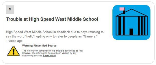 - Suttle, R.; Hogan, S.; Aumaugher, R.; Spradling, M.; Merrigan, Z.; Straub, J. University Community Members’ Perceptions of Labels for Online Media. Future Internet 2021, 13, 281. [Google Scholar] [CrossRef]
