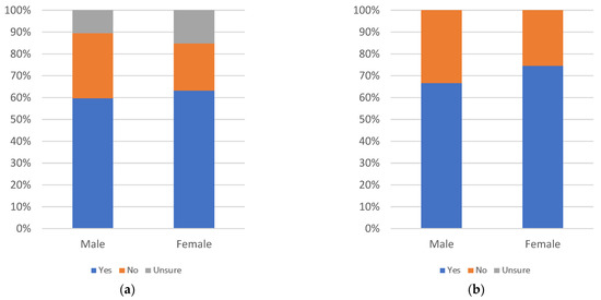 By gender, there are more yes answers among females than male respondents and nearly equal levels of uncertainty. Both groups have at least 50% of respondents answering yes, even when uncertainty is factored in.