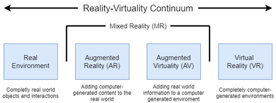 The entertainment industry was the first one that tried to utilise the opportunities given by the development of virtual reality. While the initial use of virtual reality (VR) was nothing more than a gimmick, the technology has come a long way. Now, it has been established as an important and valuable tool applied professionally in various industries, from the military [1] and medicine [2] through mental health [3], sport and rehabilitation [4], and up to fashion [5]. However, it is the application in education [6] that is of particular interest for the purpose of the following article. As established in [7], the quality of education is improved by implementing modern technologies into the process. Educators have been early adopters of many new solutions, and researchers have been searching for creative and advanced ways to facilitate the knowledge transfer. They are constantly aiming to improve the efficiency of teaching and learning (specifically the understanding of new information and applying it in practice), in contrast to simple regurgitation during a standardised test [8]. VR has been successfully used in numerous educational applications. It involves creating an interactive computer-generated environment which simulates the physical presence of the user in an artificially generated interactive world. Studies and educators’ testimonials indicate that it presents a great opportunity to improve the efficacy of the learning and teaching process. For example, VR can be used as a training environment for teachers, allowing them to improve their practical skills via hands-on scenarios [9]. Such a solution has many advantages over traditional types of training (e.g., a possibility to include very rare cases, lack of consequences for wrong actions, no equipment to wear, and no distractions). Although the domain is still in its infancy, there are already many applications that have been proven to have a significant impact on improving both the teaching and learning processes [10]. Virtual reality refers to a computer-generated simulation imitating an interactive three-dimensional environment comprising a virtual space, events, objects, and people (avatars). VR, as previously stated, is usually three-dimensional, represents the real world, follows similar or identical laws of physics, and its visual aspect is close to the appearance of the real world. A reality–virtuality continuum [11] has been used to describe and define applications based on the level of immersion. The key points on the scale are virtual reality (VR) and augmented reality (AR), as seen in Figure 1.