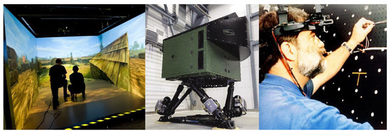 As VR solutions were introduced chronologically earlier than AR, the assumptions of VR provide for the transfer of the user to a computer-generated virtual space, so the most straightforward solutions were based on relatively simple visual projections enriched with stimulation of auditory sensations. A good example of the early implementation of the VR idea is first-person RPG games. The monitor in them acts as the user’s viewing window. The user moves in the imaginary space with the use of various controllers (keyboard, mouse, pad, joystick, etc.), and the system presents the effects of their interaction on the monitor screen in the form of an audiovisual message. Anyone who has played such games has probably noticed that the level of immersion into the virtual world increased significantly in dark or nighttime environments. The separation of the day world greatly enhances the immersion, as the user is visually and audibly separated from the real world. At night, they see only the computer monitor and hear only the speakers. The entertainment industry has recognised this dependency with the launch of capsule simulators. The capsule was designed to separate the user from the real world visually and acoustically. These solutions contributed to the creation of professional digital trainers, the level of immersion of which was increased thanks to the use of actuators for the stimulation of overload sensations and a significant expansion of visual sensations with the use of large and multi-monitor systems. A large-format variety of such solutions is 3D caves. The user is placed in the vicinity of large-format vision screens, and he or she can move freely inside, being surrounded by the generated visualisation. CA systems are often equipped with systems that recognise the user’s movement (such as Kinect) so that they can interact. The solutions discussed above are presented in Figure 2.