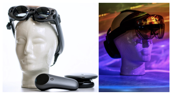 The AR application recognises the positions of markers and places artificial spatial objects in their place. The disadvantage of this method is the need to prepare and arrange markers. While solutions based on devices such as smartphones or tablets are quite good for entertainment applications, for applications requiring greater manual involvement of the user, other solutions have been searched for. Head-up display (HUD) projection systems have become a widely used modern AR solution in the automotive industry. The onboard computer cooperating with the camera acts as a driver’s assistant, displaying directions and prompts in the space of the road observed by the driver (usually as an image located a few meters in front of the windshield of the car). In recent years, a number of solutions have appeared on the market based on the idea of placing a transparent display in glasses. In this way, the natural image that surrounds us can be supplemented with additional generated images. The first such market solution was the Google Glass project, which was controversial in many countries. Currently, the most popular solutions are HoloLens and Magic Leap (see Figure 4).
