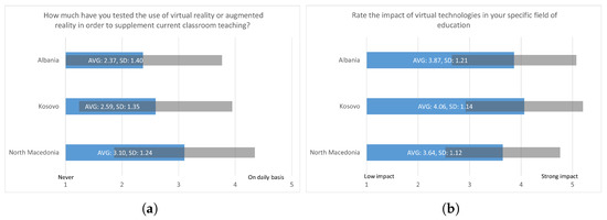 The third question provided information about the frequency of usage of virtual reality in the teaching process. From Figure 7a, we can see a low level of implementation of virtual reality in different teaching courses. Only 9% of them stated that they had regularly used VR technologies in their teaching courses. The majority of the teachers (19% + 24% + 15%) stated that they had the opportunity to use or test these technologies at some time in their teaching processes, and 33% of them never had any experience with using these technologies.