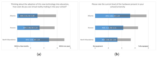 The fifth question reflects the teachers’ opinions about the speed of the implementation of virtual technologies into the teaching process. From Figure 8a, it is clear that most of the participants were positive that these technologies will be implemented in a couple of years, with 19% of them stating that this technology can be implemented within a short period of time, and 24% of the respondents were optimistic about VR being in their schools within a year or two. The majority of the respondents, consisting of 32%, were at level 3, meaning within approximately 5 years, and only 10% of them thought that these technologies could be implemented in their schools within 10 years.