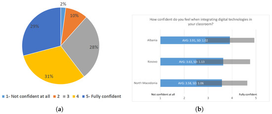 The eighth question evaluated the level of the teachers’ confidence while implementing the virtual technologies into their classes. From Figure 9a, we can see that 2% of the participants were not confident in implementing these technologies in the teaching process, 10% stated that they were a little confident about implementing these technologies without training, 28% of them were at the medium level of confidence, 31% were very confident, and 29% were fully confident.
