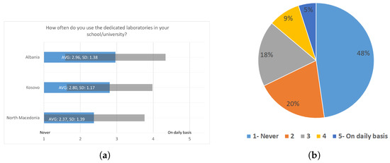The frequency of usage of the dedicated laboratories in relevant universities was stated in the ninth question. Figure 9b shows that 13% of the teachers used the laboratories daily, 21% used the laboratories 2–3 times per week, 28% used them very often, and 20% of them did not use them as much. Meanwhile, 18% of them stated that they never used their school laboratories in their teaching processes. It should be noted that the usage of laboratories was restrained this year due to a pandemic situation that may have affected this question’s results.