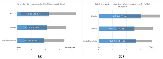 (a) Frequency of engagement in digital learning activities. (b) Impact of virtual technologies in specific field of education.