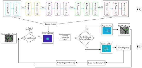 VGG-16 network structure diagram and UECO core step diagram; (a) is the 5 convolution groups of VGG-16, and the convolution groups are connected by a pooling layer. (b) is the UECO core diagram. The kernel size of the convolution layer in the convolution group was 3 3, and the number of channels in each convolution group was 64, 128, 256, and 512, respectively. The window size of the pooling layer was 2 2, reducing the feature map to 1/2 of its original size. The features of the first convolution group (conv3-64) and the features of the fifth convolution group (conv3-512) were fused by a cascade to train the correlation filter. The scale bar is 100 µm. The green and red boxes in (b) are the UECO reference.