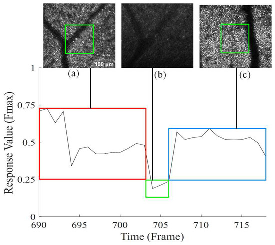 The response value ; (a,c) are the references of the two sequences (the red and blue boxes represent that the reference is not lost, 0.25) and (b) indicates the reference lost (the green box represents that the reference is lost, 0.25). The scale bar is 100 µm. The green boxes in (a,c) are the UECO reference.