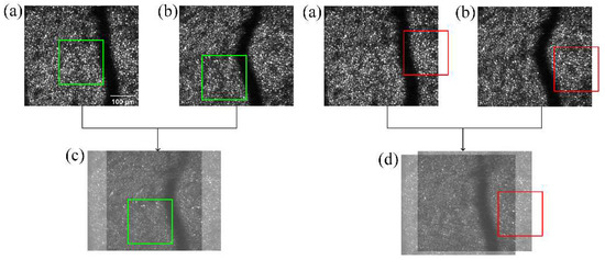 The frame with the largest vertical displacement difference; (a) is the first frame of the sequence; (b) shows the frame with the largest difference between UECO and manual registration; (c) is the result of UECO; and (d) is the result of manual registration. The green and red boxes are the references for the UECO and manual registration, respectively. For display purposes, the transparency in (c,d) was set to 50%. The scale bar is 100 µm.