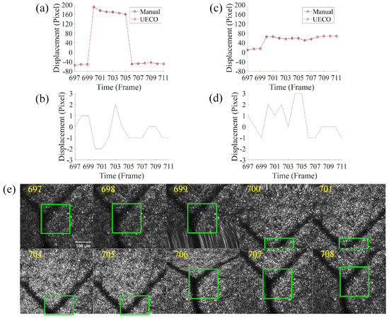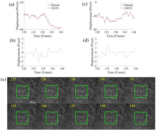 Comparison of displacement under slow drifts; (a,c) respectively show the comparison of vertical and horizontal displacement obtained by manual registration and UECO under slow drifts; (b,d) are the differences in the vertical and horizontal displacement between UECO and manual registration; and (e) is 10 frames in an image sequence of slow drifts. The green box is the UECO reference and the yellow text in the graph represents the current frame number. The frame number corresponds to the frame number in the original video. The scale bar is 100 µm.