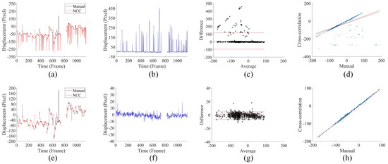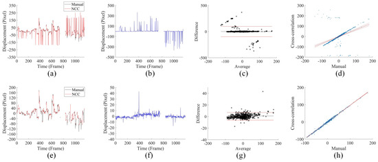 Horizontal displacement comparison chart; (a) shows the comparison of vertical displacement obtained by cross-correlation-based methods and manual registration; (b) is the difference between the two methods; and (c) is the Bland–Altman plot. The black line is the mean difference of the two methods. Red lines indicate the 95% confidence interval (mean 1.96 standard deviation). The Pearson correlation coefficient curve is shown in (d), and (e–h) show the results after removal of the wrong displacement. The frame number in the x-axis corresponds to the frame number in the original video.