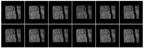 Notably, the difference between the vertical and horizontal displacements was within 10 pixels for most frames, but as shown in Figure 5c and Figure 6c, the difference reached 20 pixels or more for a few frames (the frame with the largest difference has been marked). This was caused by intra-frame distortion. Figure 7 and Figure 8 give the images with the largest vertical/horizontal displacement differences.