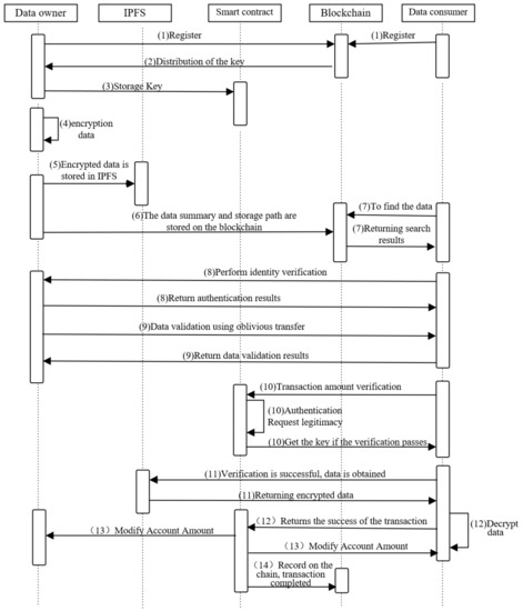 - If the user needs to sell the data, the data are encrypted, hashed, and signed, the data ciphertext and signature are uploaded to the IPFS distributed file system, and the data summary is recorded on the blockchain.