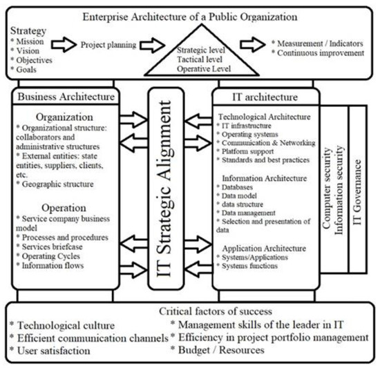 Most enterprise IT architectures are based on strategic planning and the four dimensions of the TOGAF framework [16,17,18,19]. Some key factors that support enterprise architecture should be considered, such as strategic alignment and IT governance [20,21], the technological culture of the organization’s staff, efficient communication channels between business and technology specialists, managerial skills of the IT director [20,22], user satisfaction [23] and the efficiency in enterprise architecture project portfolio management [24].
