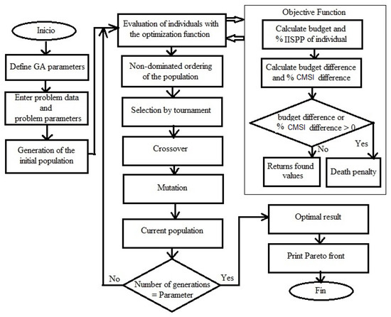 In the third phase, with the strategic projects planned and the criteria and restrictions of the organization known, a mathematical model was proposed for the optimization of the management of strategic projects to improve the information security of a Public Organization based on the generic model of multi-objective optimization problem (MOP) and through the genetic algorithm NSGA-II, considering that evolutionary computation is of the current trends to efficiently solve this type of problem according to the review of the literature. According to [91], the generic model used, considering the sets of n decision variables, k objective functions and m restrictions, is as follows: